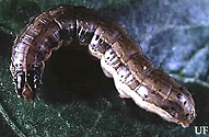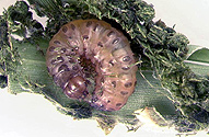 Tropical Sod Webworms: Tropical sod webworm larvae are gray-green and have brown spots on each segment. Mature larvae can be 3/4 to 1 inch in length, and they pupate in the thatch or on the soil surface. Mature caterpillars eat a lot before they pupate and consume patches of turfgrass down to the crown. Because the turf looks scalped so quickly, people think that the damage occurs "overnight."