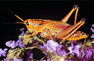 Eastern Lubber Grasshopper: Eastern lubber grasshopper is surely the most distinctive grasshopper species found in the southeastern USA. Adults are colorful, but the color pattern varies. Often the adult eastern lubber is mostly yellow or tawny, with black on the distal portion of the antennae, on the pronotum, and on the abdominal segments. It is unable to fly, a poor leaper, and clumsy; but, it is a good climber. They damage a wide range of plants, crops, and fruit trees.